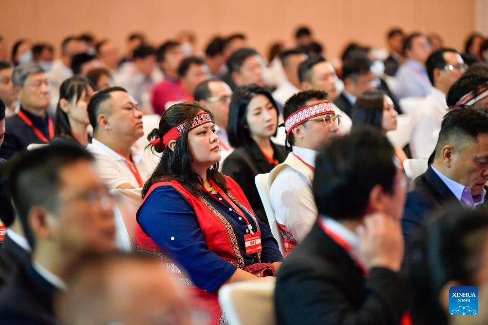 This photo taken on Aug. 22, 2023 shows the opening ceremony of the 14th Tianjin-Taiwan trade fair in north China's Tianjin. The four-day trade fair kicked off in Tianjin on Tuesday. (Xinhua/Sun Fanyue)
