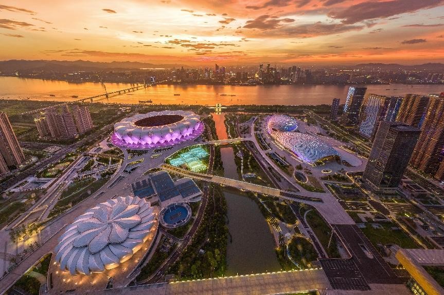 Photo taken on July 8, 2022, shows the Hangzhou Olympic Sports Center cluster for the 19th Asian Games to be held in Hangzhou, east China's Zhejiang province. (People's Daily Online/Ding Junhao)