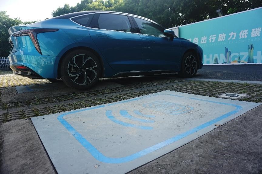 A new energy vehicle is charging at a wireless charging station run by the State Grid in the Asian Games village in Hangzhou, east China's Zhejiang province, Aug. 7, 2023. (People's Daily Online/Long Wei)