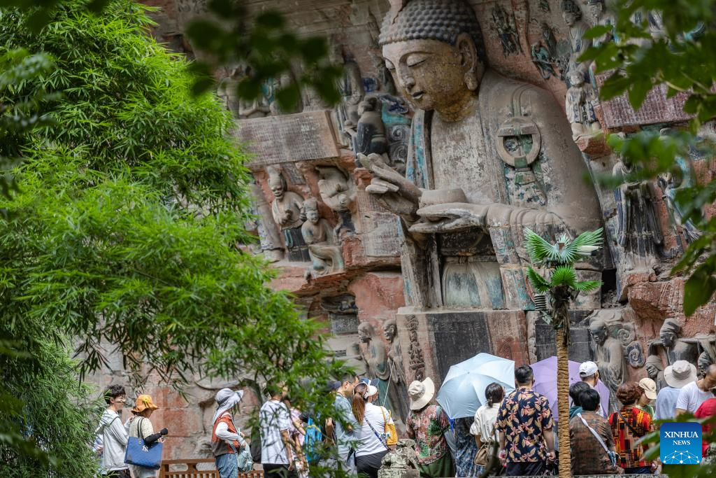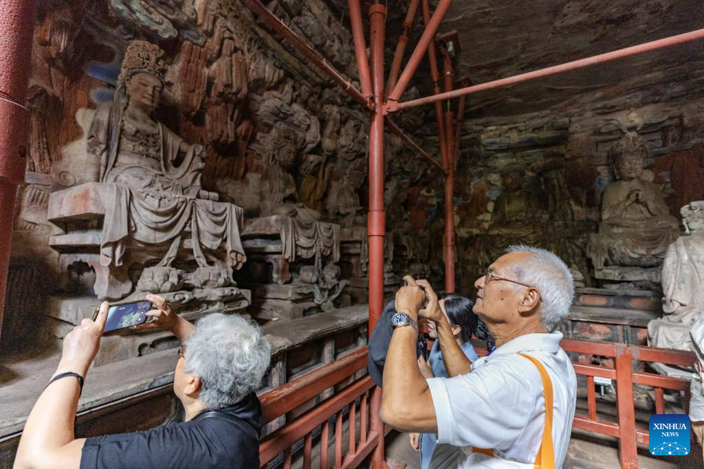 Guests visit a scenic spot of Dazu Rock Carvings in Chongqing, southwest China, Aug. 19, 2023. (Xinhua/Huang Wei)