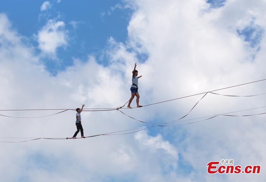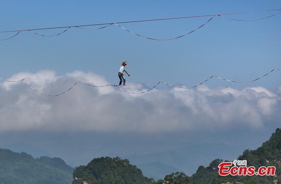 Eight slackline walkers competed in the high-altitude tightrope-walking contest on Tuesday in Hunan.