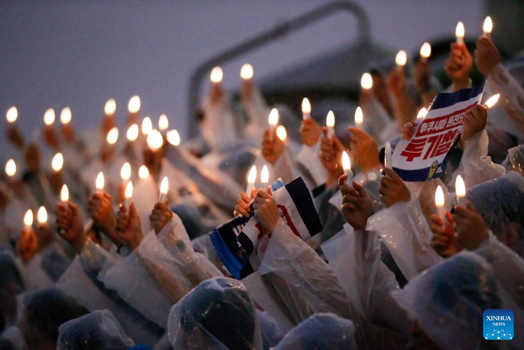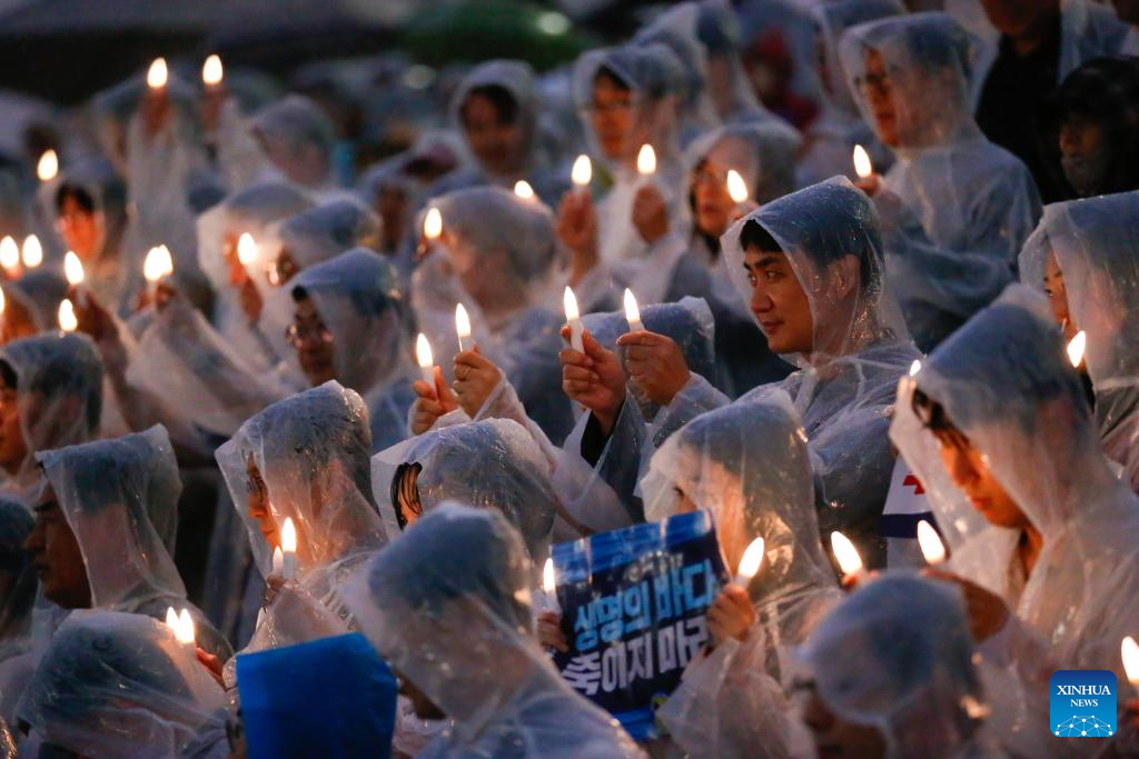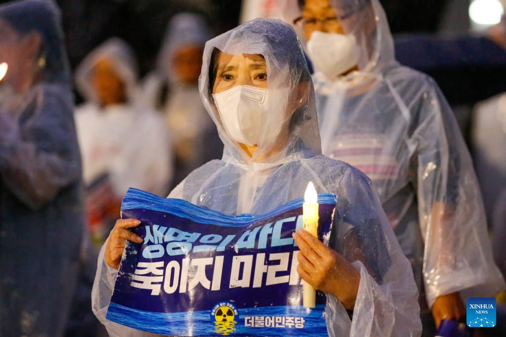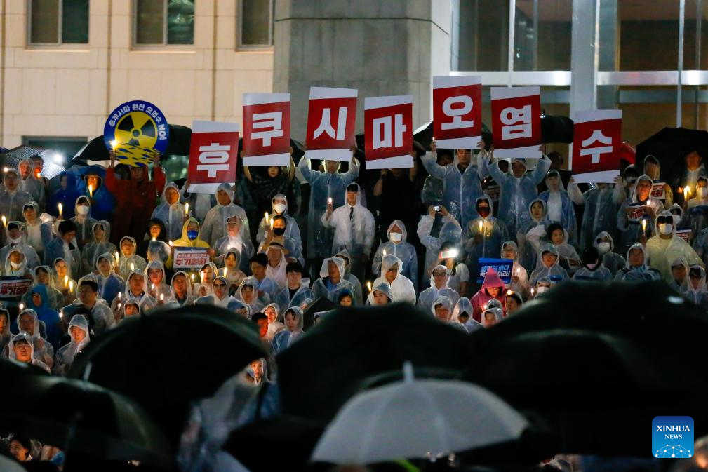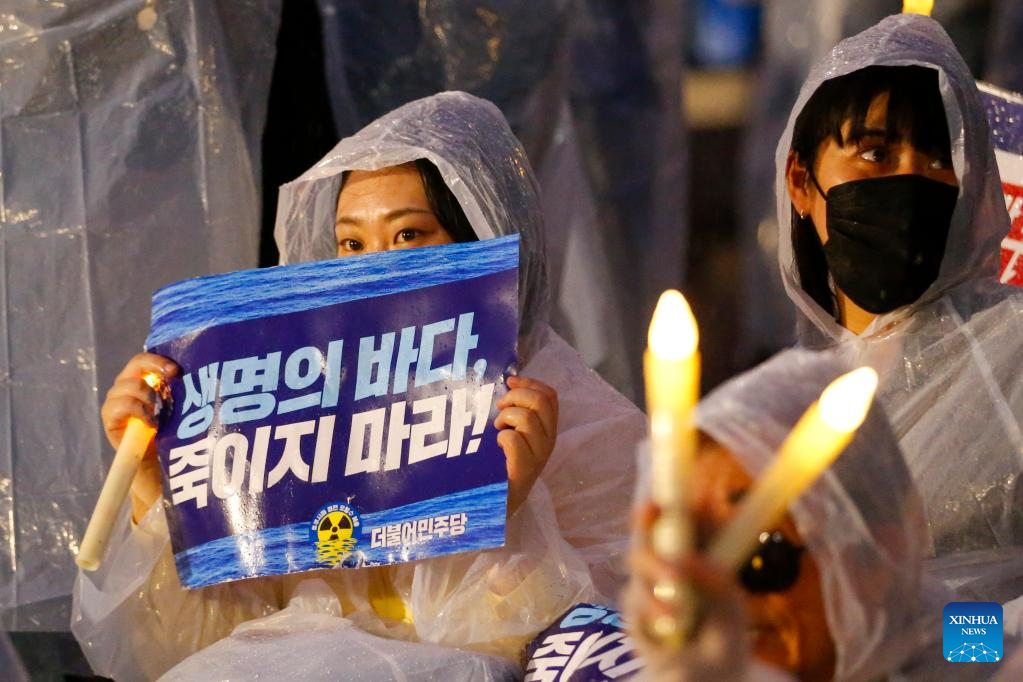 People take part in a rally held by South Korea's main opposition Democratic Party to oppose Japan's decision to start releasing nuclear-contaminated wastewater in Seoul, South Korea, Aug. 23, 2023. (Xinhua/Wang Yiliang)