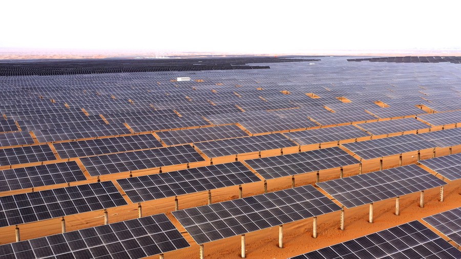 This photo taken on April 16, 2023 shows a photovoltaic base on the Tengger Desert in Zhongwei City, northwest China's Ningxia Hui Autonomous Region. (Xinhua)