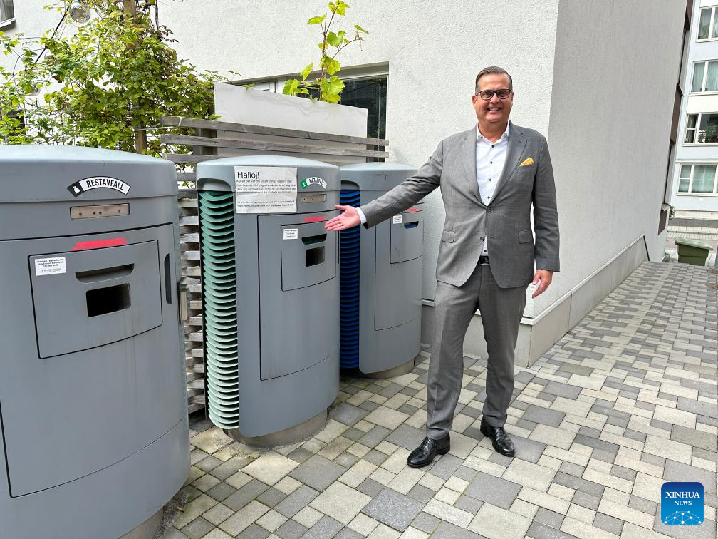 Joakim Karlsson, CEO and president of Sweden's innovative waste collection company Envac AB, poses for a photo in front of his company's waste collection system in Stockholm, Sweden, on Aug. 21, 2023. Collaboration with China on the development of smart and sustainable cities is worth long-term commitment, the chief executive officer (CEO) and president of Sweden's innovative waste collection company Envac AB told Xinhua in a recent exclusive interview. (Xinhua/He Miao)