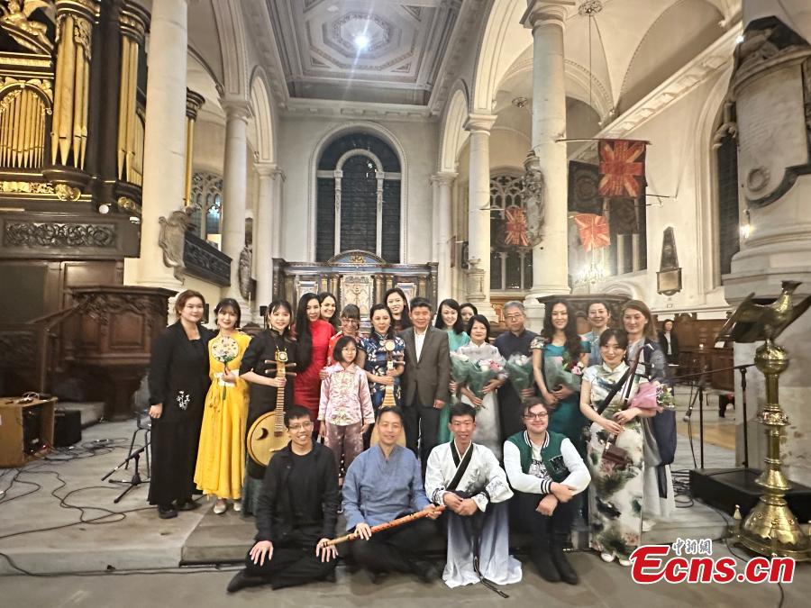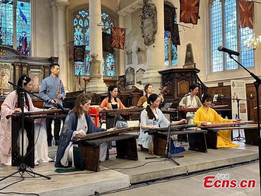 Musicians play Chinese music " Three Lanes of Plum Blossom" during the gala concert of London International Chinese Music Festival 2023 in London, UK, Aug. 22, 2023. (Photo: China News Service/Ouyang Kaiyu)