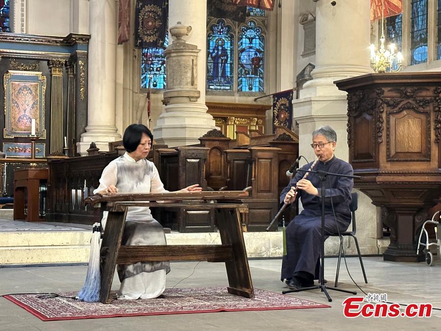 Musicians play traditional Chinese musical instruments Guqin and Xiao during the gala concert of London International Chinese Music Festival 2023 in London, UK, Aug. 22, 2023. (Photo: China News Service/Ouyang Kaiyu)