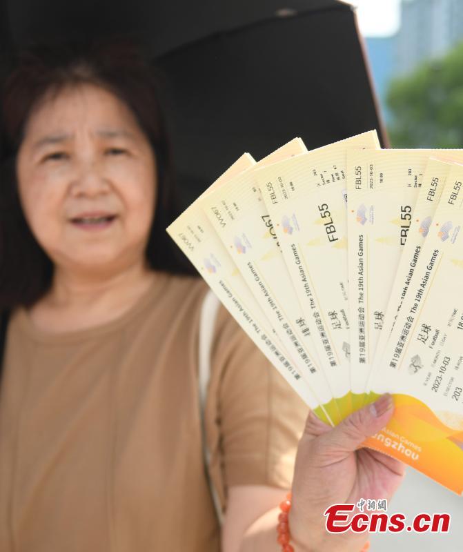 A woman displays the official Hangzhou Asian Games tickets she purchased at an offline ticket office in Hangzhou, east China's Zhejiang Province, Aug. 23, 2023. (Photo: China News Service/Wang Gang)