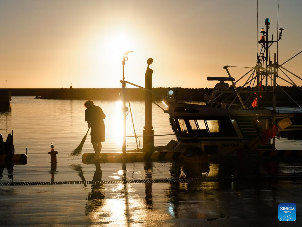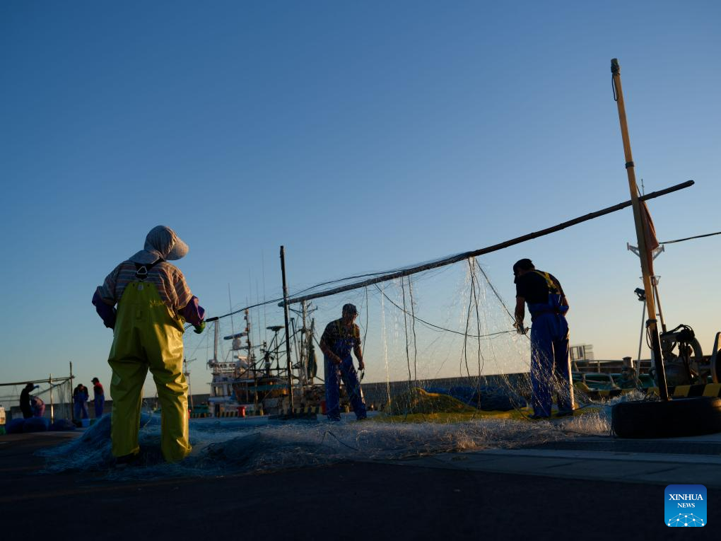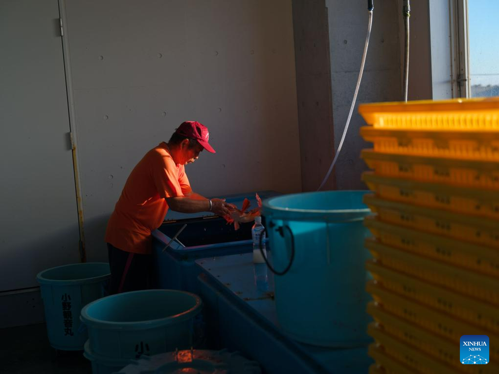 A fisherman cleans at Tsurishihama Fishing Port after fishing in Shinchi Town, Fukushima Prefecture, Japan, Aug. 23, 2023. (Xinhua/Zhang Xiaoyu)
