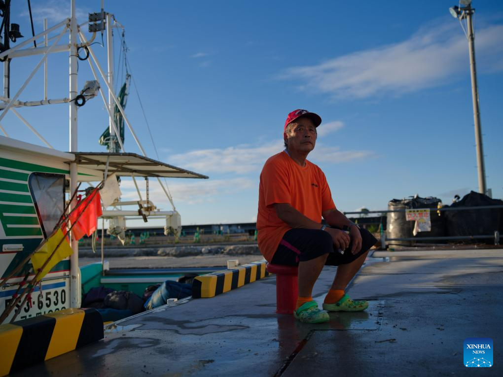 Fisherman Ono Haruo sits at Tsurishihama Fishing Port after fishing in Shinchi Town, Fukushima Prefecture, Japan, Aug. 23, 2023. (Xinhua/Zhang Xiaoyu)