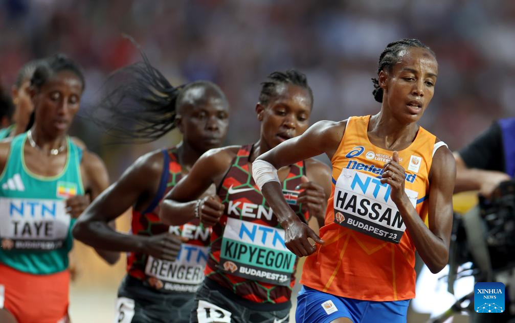 Sifan Hassan (R) of the Netherlands competes during the Women's 5000m Heat of the World Athletics Championships Budapest 2023 in Budapest, Hungary, Aug. 23, 2023. (Xinhua/Li Ying)
