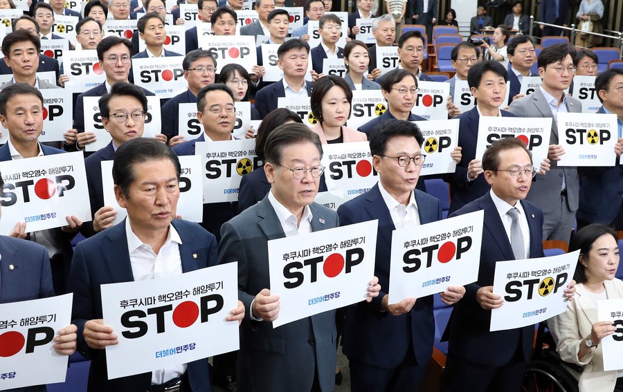 Lee Jae-myung (2nd, L, front), chairman of South Korea's main opposition Democratic Party, and parliament members protest against Japan's decision to release nuclear-contaminated wastewater in Seoul, South Korea, Aug. 24, 2023. Japan started releasing nuclear-contaminated wastewater from the crippled Fukushima Daiichi Nuclear Power Plant into the Pacific Ocean on Thursday, despite raging opposition from both at home and abroad. (NEWSIS via Xinhua)