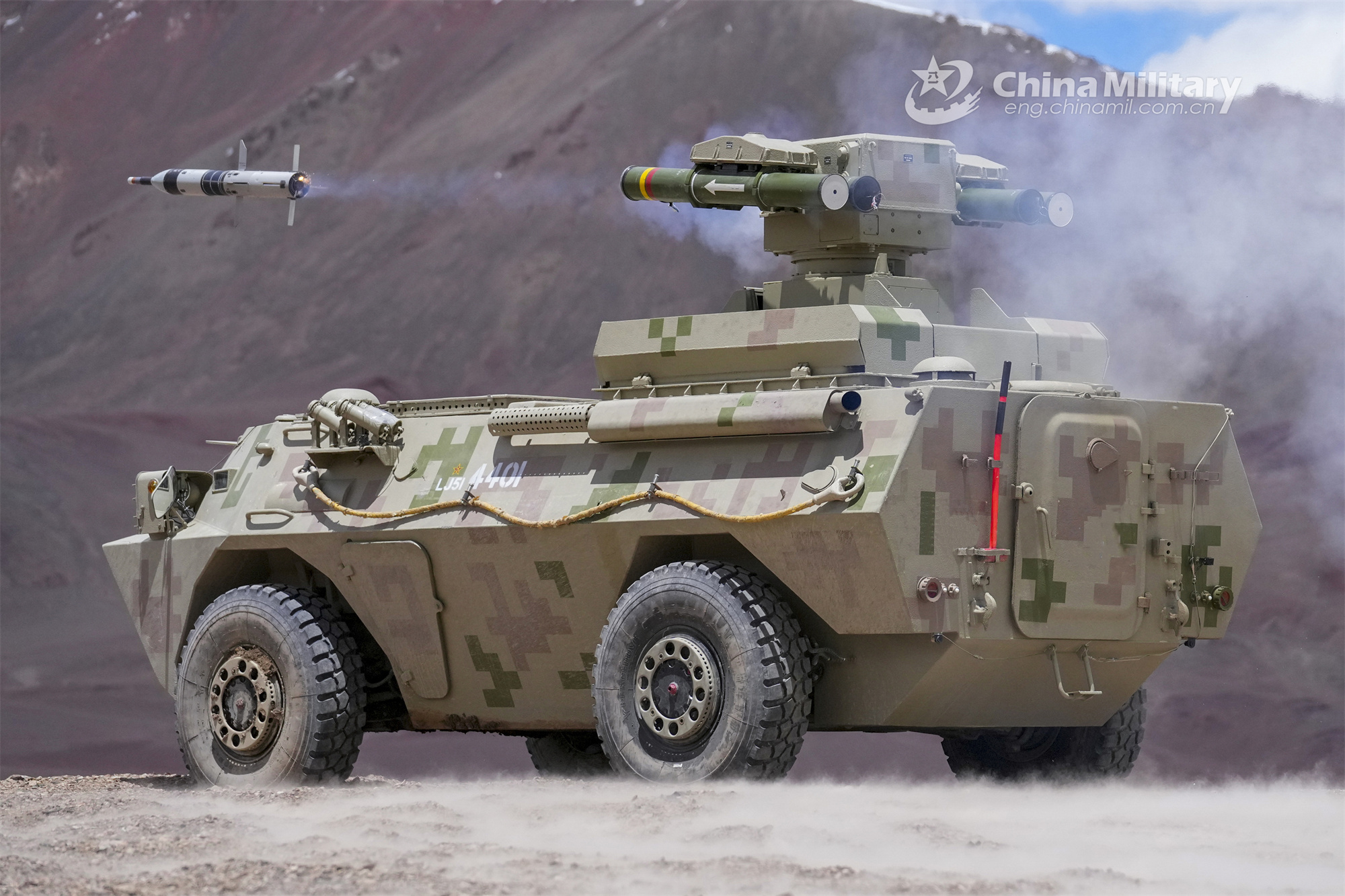 A wheeled heavy armored vehicle attached an army unit fires an HJ-9 anti tank missile at mock target during a live-fire training exercise. The training exercise held recently aimed to test the weapons' tactical qualities in harsh environment. (eng.chinamil.com.cn/Photo by Feng Chiyu)