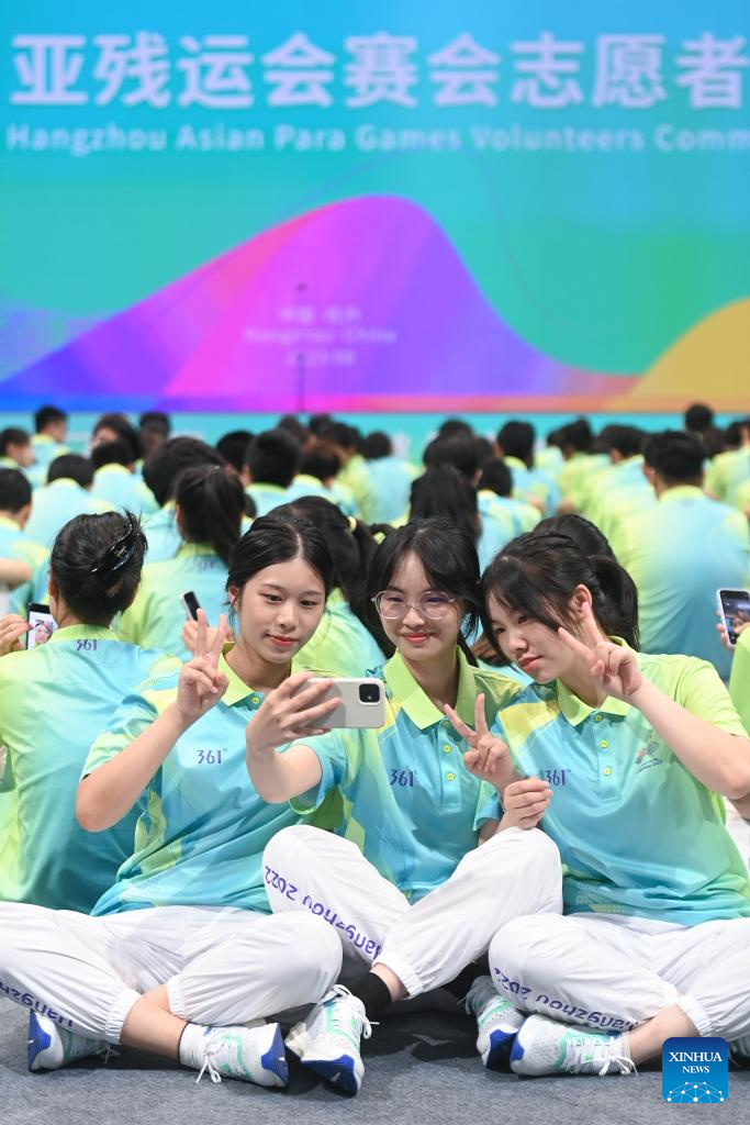 Volunteers take selfies prior to the Hangzhou Asian Games and Hangzhou Asian Para Games Volunteers Commencement Ceremony in Hangzhou, capital of east China's Zhejiang Province, Aug. 24, 2023. (Xinhua/Huang Zongzhi)