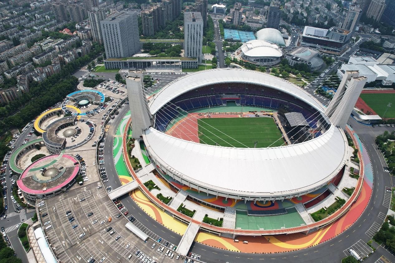 Photo shows the Huanglong Sports Centre Stadium in Xihu district, Hangzhou, east China's Zhejiang province. The venue will host soccer events during the Hangzhou Asian Games. (People's Daily Online/Long Wei)