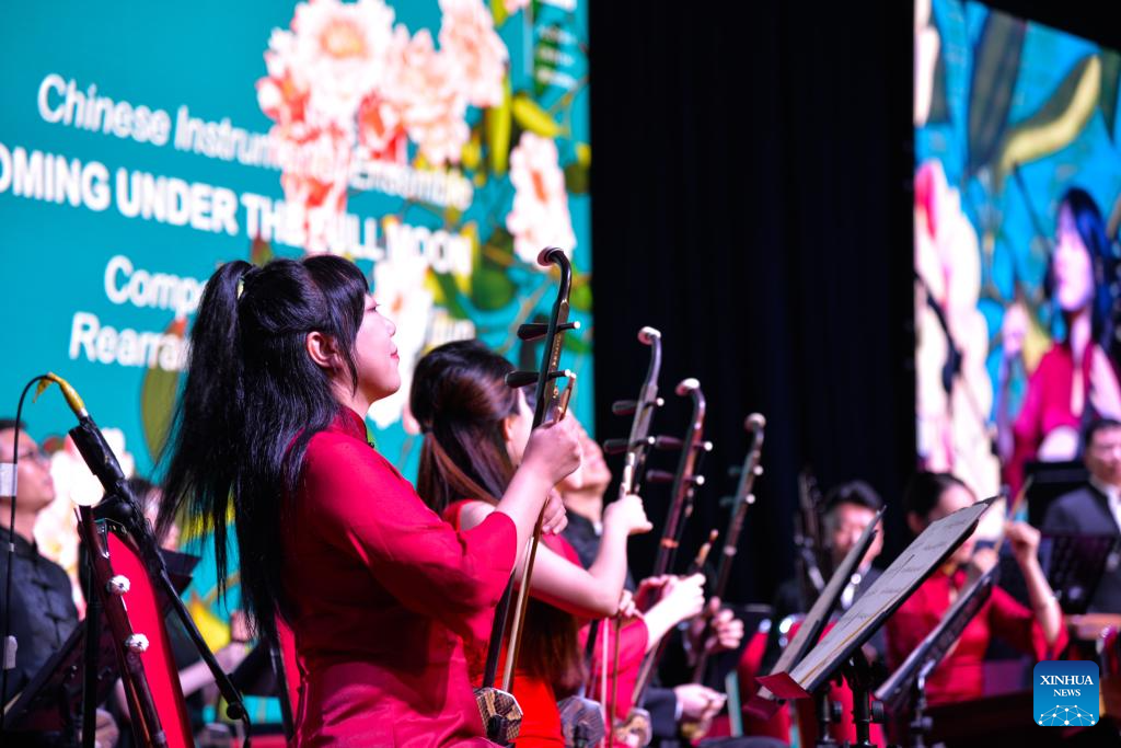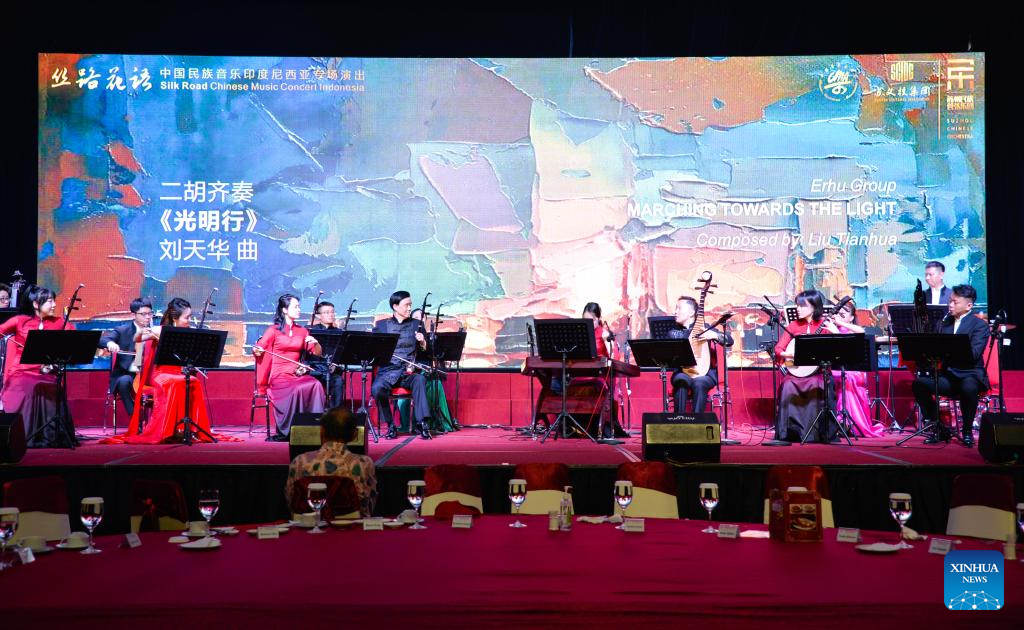 Artists perform Chinese Instrumental Ensemble "Flowers Blooming Under the Full Moon" during the Silk Road Chinese Music Concert Indonesia in Sun City, Jakarta, Indonesia, on Aug. 24, 2023. (Xinhua/Xu Qin)