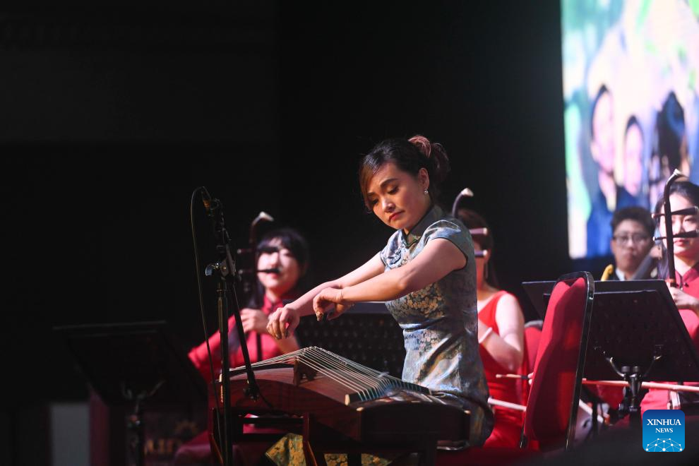 An artist performs Guzheng Solo "Tunes of Qin Mulberry" during the Silk Road Chinese Music Concert Indonesia in Sun City, Jakarta, Indonesia, on Aug. 24, 2023. (Xinhua/Zulkarnain)