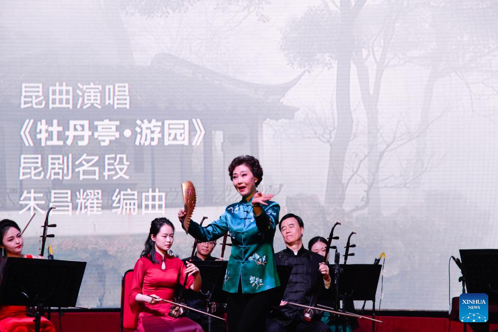 An artist performs Kunqu "Strolling in the Garden from Peony Pavilion" during the Silk Road Chinese Music Concert Indonesia in Sun City, Jakarta, Indonesia, on Aug. 24, 2023. (Xinhua/Xu Qin)