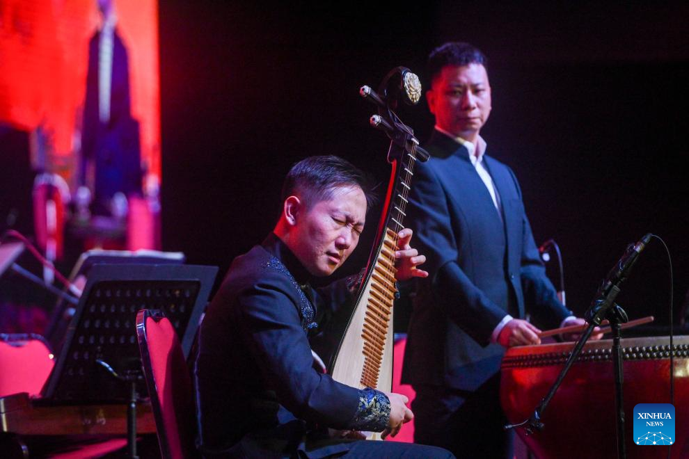 An artist performs Pipa Solo "Ambush from All Sides" during the Silk Road Chinese Music Concert Indonesia in Sun City, Jakarta, Indonesia, on Aug. 24, 2023. (Xinhua/Zulkarnain)