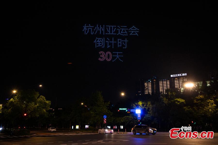 A spectacular drone show is staged to mark the 30-day countdown to the 19th Asian Games at Shangcheng Sports Center Stadium in Hangzhou, east China's Zhejiang Province, Aug. 24, 2023. (Photo: China News Service/Xiao Jian)