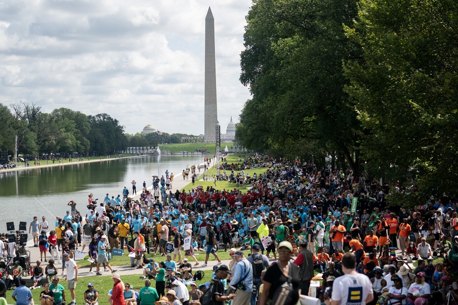 People gather during an event commemorating the 60th anniversary of the March on Washington at the Lincoln Memorial in Washington, D.C., the United States, Aug. 26, 2023. (Xinhua/Liu Jie)