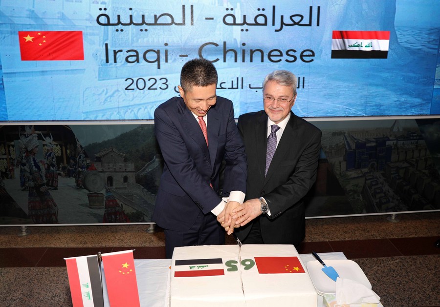 Chinese Ambassador to Iraq Cui Wei and Iraqi Deputy Minister for bilateral relations Mohammed Hussein Bahr Al-Uloom cut a cake prepared on the occasion of the 65th anniversary of the diplomatic ties between China and Iraq in Baghdad, Iraq, on August 27, 2023. (Xinhua/Khalil Dawood)