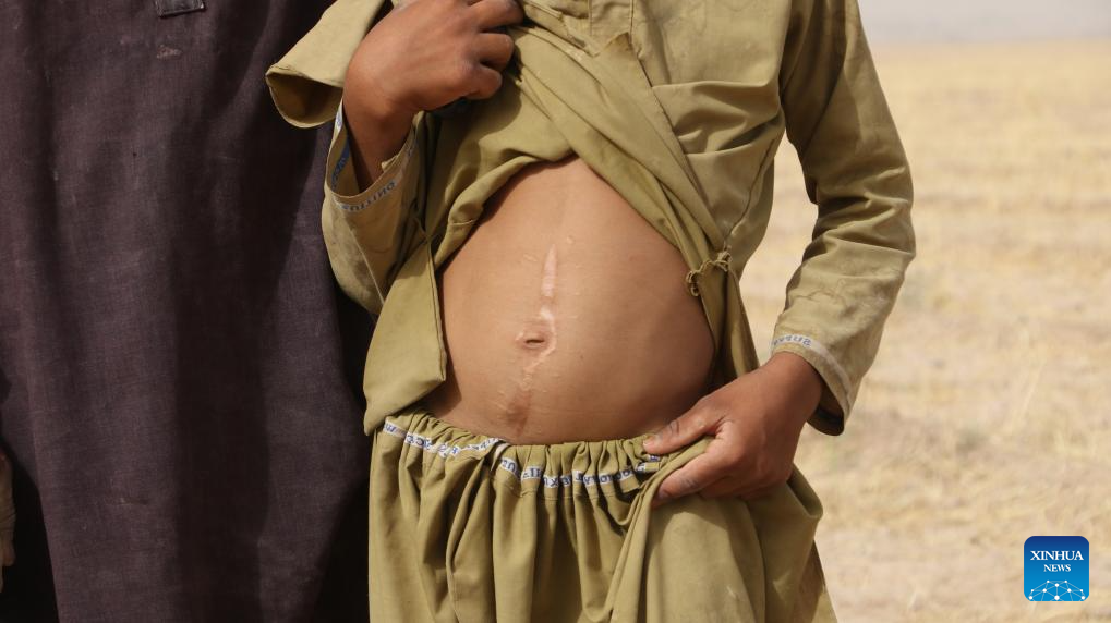 A boy shows his belly hurt by a blast of unexploded ordnance left by U.S. forces in Farah Province, Afghanistan, July 26, 2023. (Photo by Marshal/Xinhua)