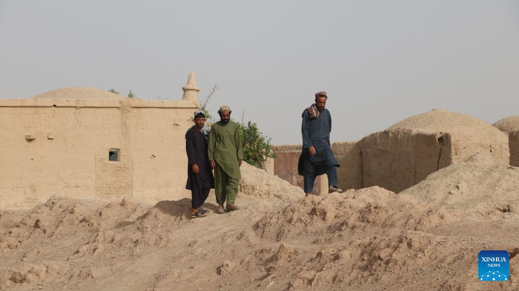 People walk in a village threatened by unexploded ordnance left by U.S. forces in Farah Province, Afghanistan, July 26, 2023. (Photo by Marshal/Xinhua)