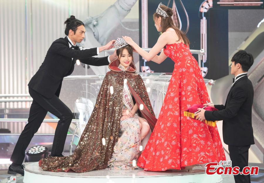 Hilary Chong is crowned champion at the Miss Hong Kong 2023 pageant by Denice Lam, the winner of "Miss Hong Kong"2022, Aug. 27, 2023. (Photo: China News Service/Hou Yu)