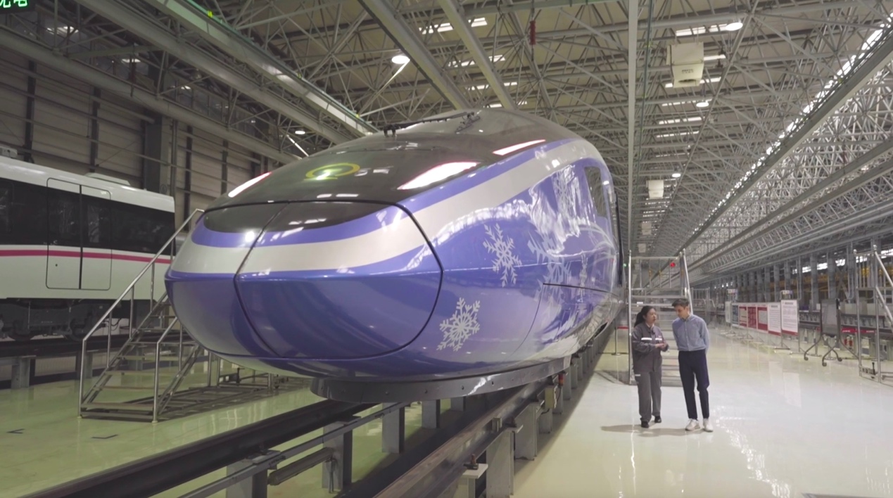 Photo taken on June 12, 2023, shows a winter sports-themed "Fuxing" high-speed train at CRRC Changchun Railway Vehicles Co., Ltd. in Changchun, northeast China's Jilin Province. (People's Daily Online/Liu Ning)