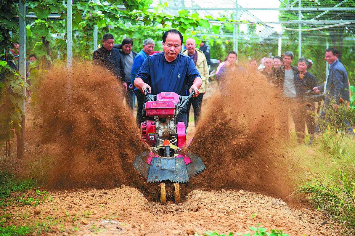 A farmer in Pujiang demonstrates the use of a ditch-digging machine. HU XIAOFEI/FOR CHINA DAILY