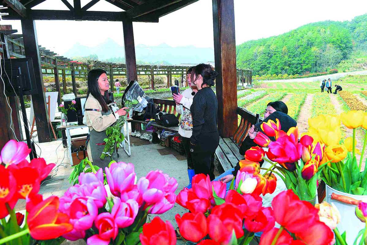 Employees from a flower company stage a livestreaming broadcast in Hangping town, Pujiang. WENG XINYANG/XINHUA