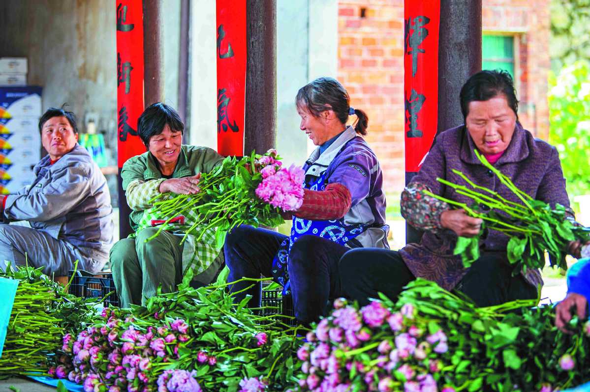 Villagers arrange freshly gathered peonies in Hangping, Pujiang, in May. HU XIAOFEI/FOR CHINA DAILY