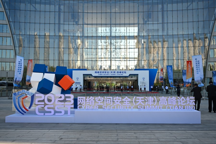 This photo shows the exterior view of the venue for the first Cyber Security Summit (Tianjin) in north China's Tianjin, Aug. 28, 2023. (Xinhua/Sun Fanyue)