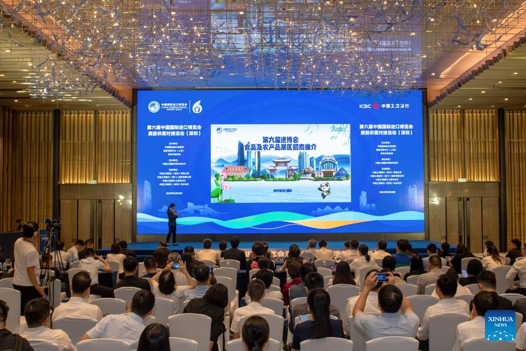 This photo taken on Aug. 29, 2023 shows a scene during a pre-exhibition supply and demand matchmaking meeting for the sixth China International Import Expo in Shenzhen, south China's Guangdong Province. A pre-exhibition supply and demand matchmaking meeting for the sixth China International Import Expo (CIIE) kicked off in Shenzhen on Tuesday, building a platform for communications among over 200 enterprises of the Guangdong-Hong Kong-Macao Greater Bay Area and about 60 exhibitors from Intelligent Industry and Information Technology, Food and Agricultural Products and Trade in Services exhibition areas of the CIIE. (Xinhua/Mao Siqian)