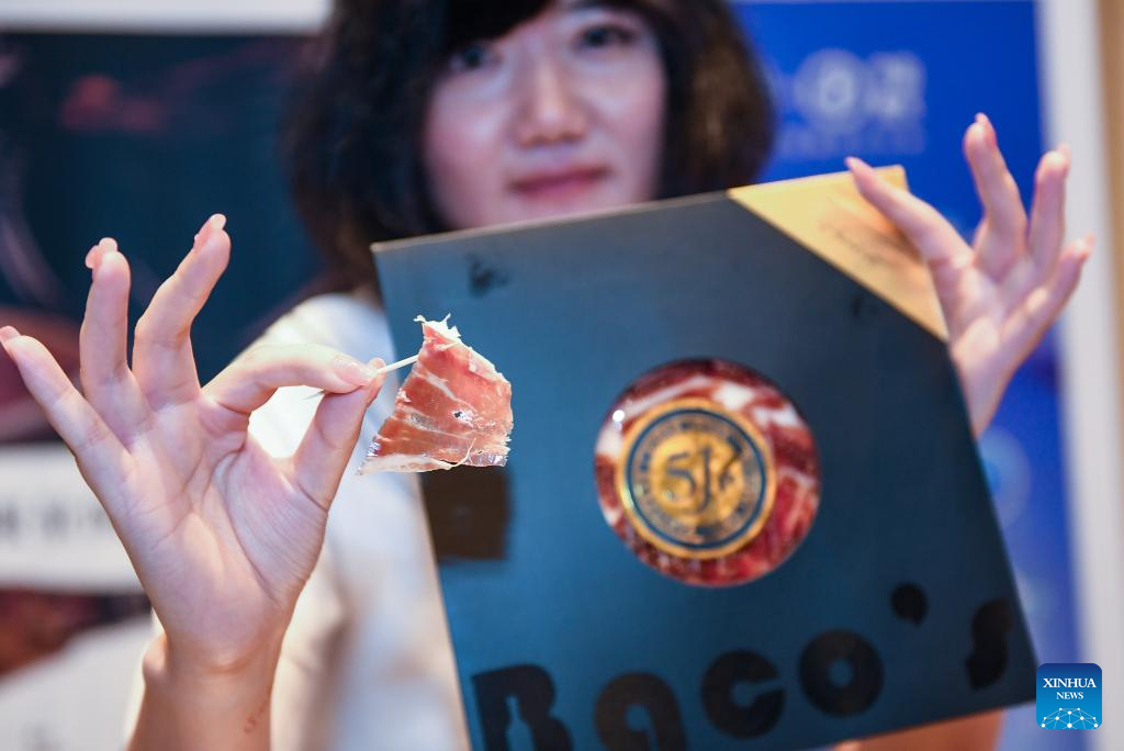 An exhibitor shows a slice of Iberian ham during a pre-exhibition supply and demand matchmaking meeting for the sixth China International Import Expo in Shenzhen, south China's Guangdong Province, Aug. 29, 2023. A pre-exhibition supply and demand matchmaking meeting for the sixth China International Import Expo (CIIE) kicked off in Shenzhen on Tuesday, building a platform for communications among over 200 enterprises of the Guangdong-Hong Kong-Macao Greater Bay Area and about 60 exhibitors from Intelligent Industry and Information Technology, Food and Agricultural Products and Trade in Services exhibition areas of the CIIE. (Xinhua/Mao Siqian)