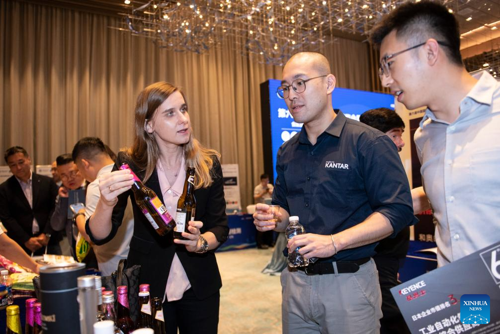 A staff member of the Polish investment and trade agency (front, L) introduces beer to a purchasing agent during a pre-exhibition supply and demand matchmaking meeting for the sixth China International Import Expo in Shenzhen, south China's Guangdong Province, Aug. 29, 2023. A pre-exhibition supply and demand matchmaking meeting for the sixth China International Import Expo (CIIE) kicked off in Shenzhen on Tuesday, building a platform for communications among over 200 enterprises of the Guangdong-Hong Kong-Macao Greater Bay Area and about 60 exhibitors from Intelligent Industry and Information Technology, Food and Agricultural Products and Trade in Services exhibition areas of the CIIE. (Xinhua/Mao Siqian)
