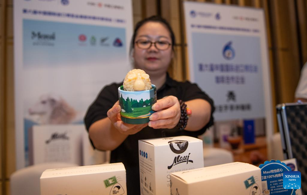 An exhibitor shows a soap made from goat milk during a pre-exhibition supply and demand matchmaking meeting for the sixth China International Import Expo in Shenzhen, south China's Guangdong Province, Aug. 29, 2023. A pre-exhibition supply and demand matchmaking meeting for the sixth China International Import Expo (CIIE) kicked off in Shenzhen on Tuesday, building a platform for communications among over 200 enterprises of the Guangdong-Hong Kong-Macao Greater Bay Area and about 60 exhibitors from Intelligent Industry and Information Technology, Food and Agricultural Products and Trade in Services exhibition areas of the CIIE. (Xinhua/Mao Siqian)