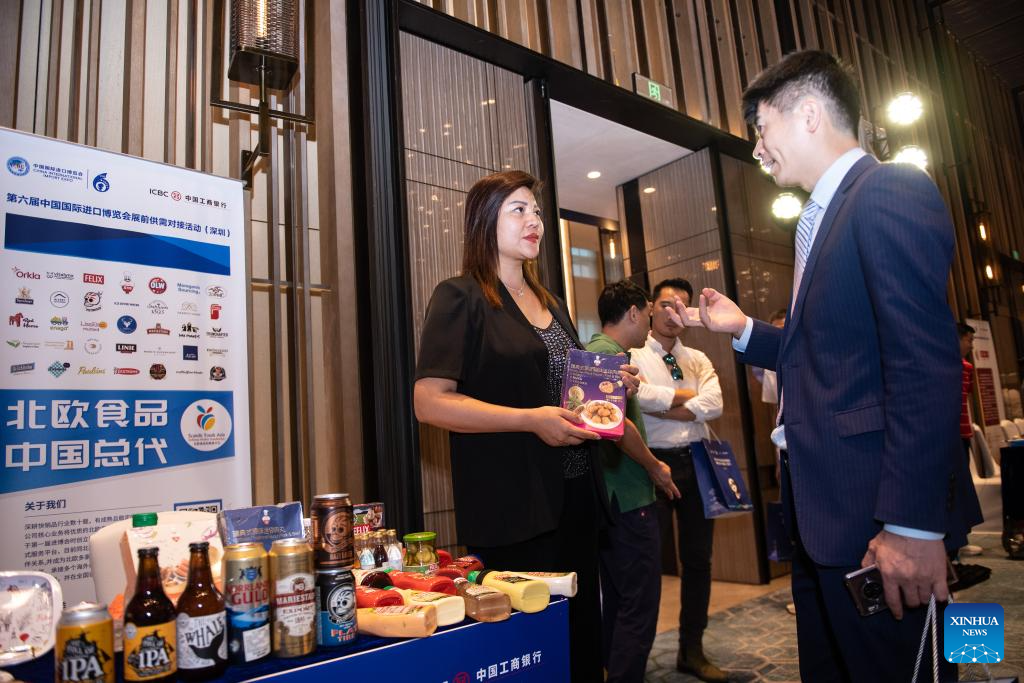 A purchasing agent (R) learns about foods from northern Europe during a pre-exhibition supply and demand matchmaking meeting for the sixth China International Import Expo in Shenzhen, south China's Guangdong Province, Aug. 29, 2023. A pre-exhibition supply and demand matchmaking meeting for the sixth China International Import Expo (CIIE) kicked off in Shenzhen on Tuesday, building a platform for communications among over 200 enterprises of the Guangdong-Hong Kong-Macao Greater Bay Area and about 60 exhibitors from Intelligent Industry and Information Technology, Food and Agricultural Products and Trade in Services exhibition areas of the CIIE. (Xinhua/Mao Siqian)