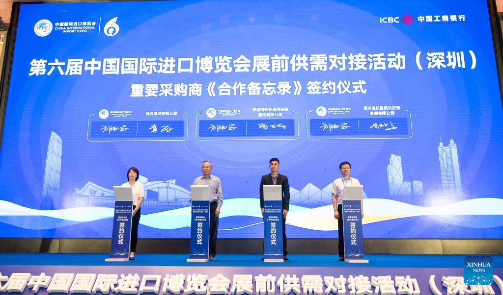 This photo taken on Aug. 29, 2023 shows a signing ceremony during a pre-exhibition supply and demand matchmaking meeting for the sixth China International Import Expo in Shenzhen, south China's Guangdong Province. A pre-exhibition supply and demand matchmaking meeting for the sixth China International Import Expo (CIIE) kicked off in Shenzhen on Tuesday, building a platform for communications among over 200 enterprises of the Guangdong-Hong Kong-Macao Greater Bay Area and about 60 exhibitors from Intelligent Industry and Information Technology, Food and Agricultural Products and Trade in Services exhibition areas of the CIIE. (Xinhua/Mao Siqian)