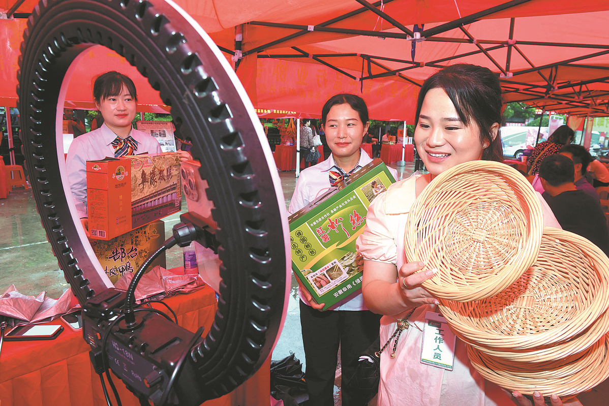 A livestreaming host promotes sales of products with local characteristics during an expo in Fuyang, Anhui province. WANG BIAO/FOR CHINA DAILY