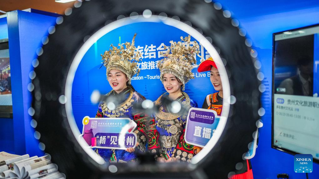 College students do livestreaming during the 2023 China-ASEAN Education Cooperation Week in Gui'an New Area, southwest China's Guizhou Province, Aug. 29, 2023. The 2023 China-ASEAN Education Cooperation Week kicked off here on Tuesday. (Xinhua/Tao Liang)