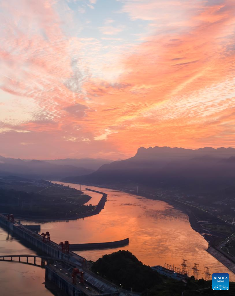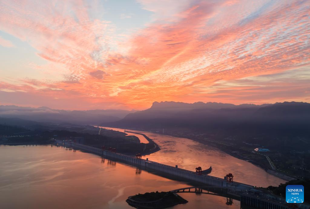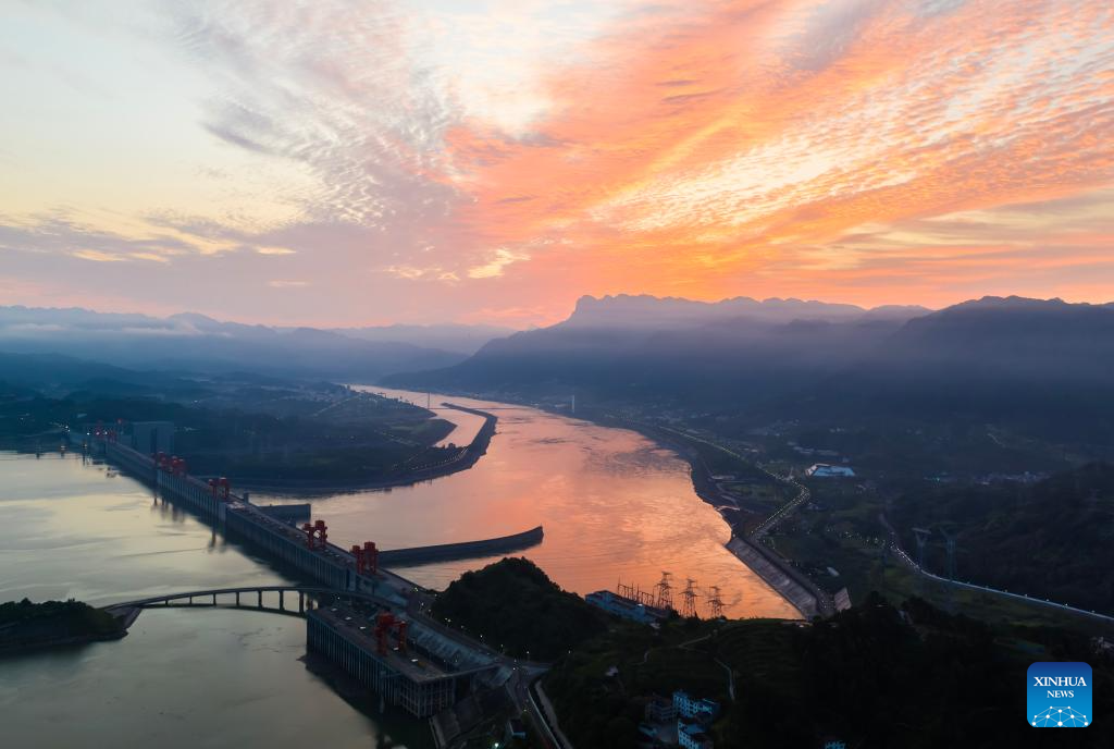 This aerial photo taken on Aug. 30, 2023 shows sunrise over the Three Gorges dam in Zigui County, Yichang City of central China's Hubei Province. (Photo by Zheng Jiayu/Xinhua)