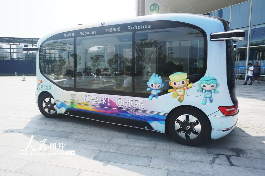 Photo shows a driverless bus at the Shaoxing Baseball and Softball Sports Center, a venue for the 19th Asian Games to be held in Hangzhou, capital of east China's Zhejiang Province, Aug. 28, 2023. (People's Daily Online/Long Wei)