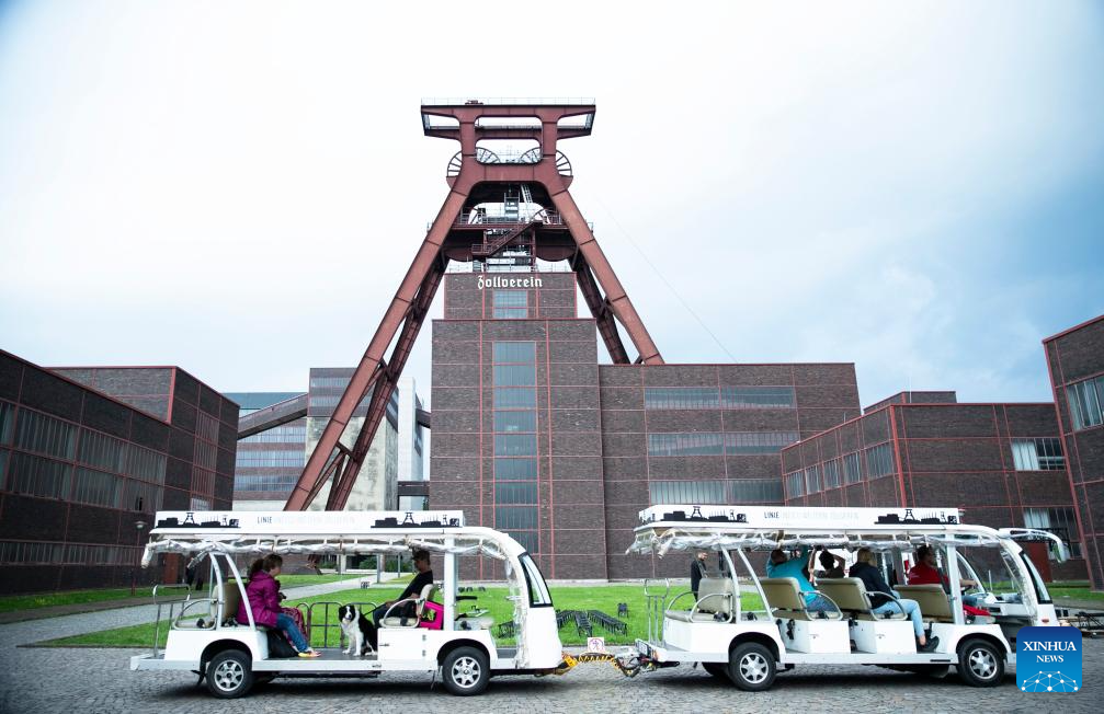 Tourists take electric sightseeing cars in the Zollverein coal mine industrial complex in Essen, Germany, Aug. 16, 2023. (Xinhua/Zhang Fan)