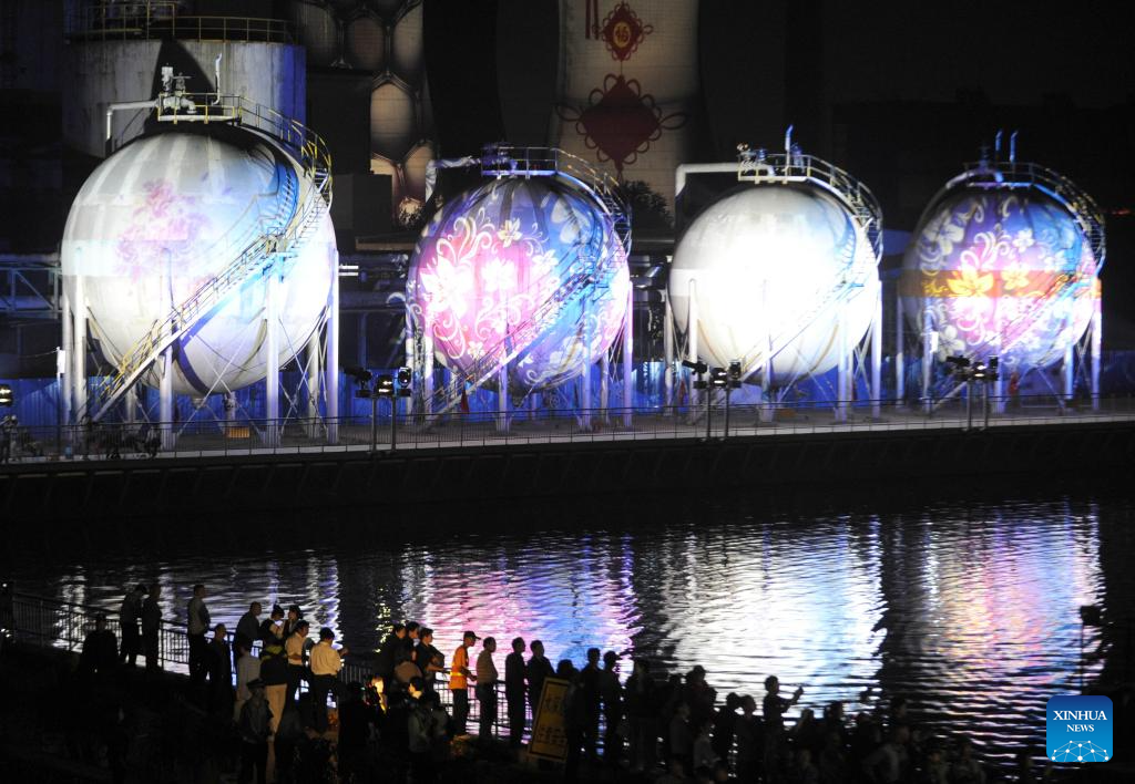 This file photo taken on Sept. 17, 2012 shows people watching night view during a light festival at the Shougang Park in Shijingshan District of Beijing, capital of China. (Xinhua/Luo Xiaoguang)