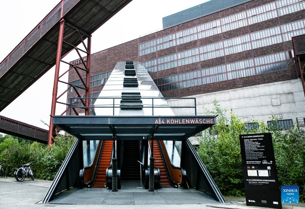 This photo taken on Aug. 16, 2023 shows an escalator transformed from a coal conveyor belt at the Ruhr Museum in the Zollverein coal mine industrial complex in Essen, Germany. (Xinhua/Zhang Fan)