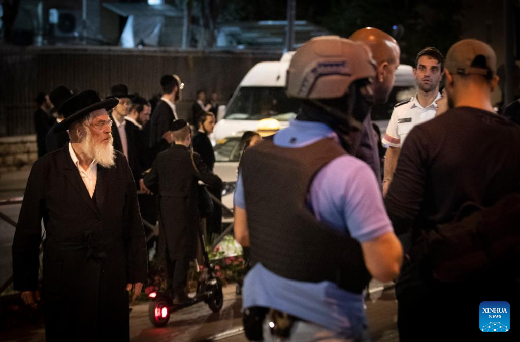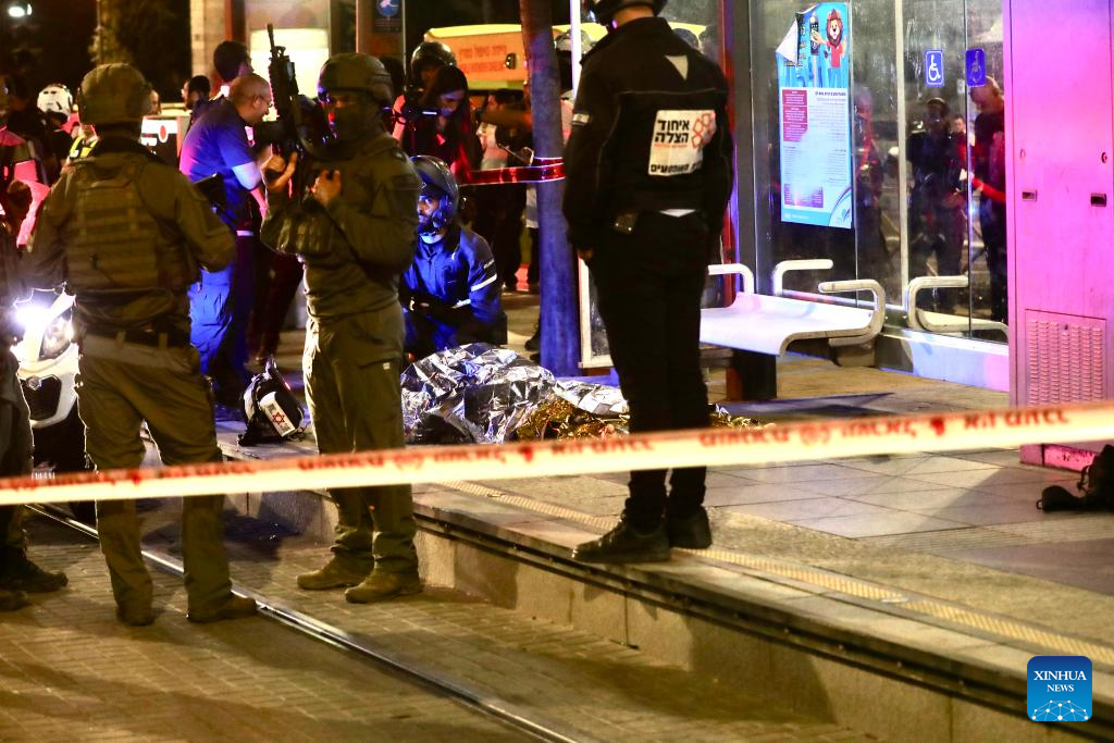 Israeli security forces work at the site of a knife attack at a light rail stop near East Jerusalem, on Aug. 30, 2023. A Palestinian dressed as an ultra-Orthodox Jew stabbed an Israeli in Jerusalem on Wednesday before being shot and killed by the Israeli police. (Xinhua/Chen Junqing)