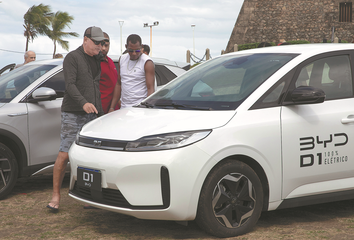 Visitors look at a BYD electric vehicle in Salvador, capital of Bahia, Brazil, on July 4. WANG TIANCONG/XINHUA