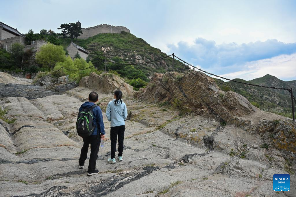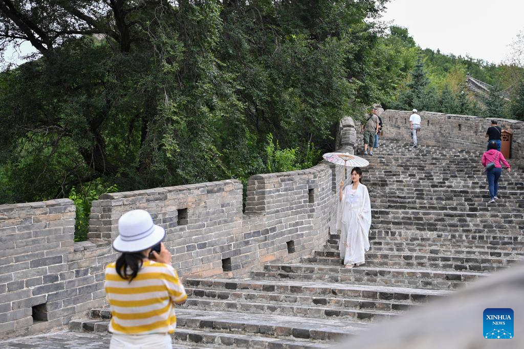 This photo taken on Aug. 29, 2023 shows people visiting the Yanmen Pass in Daixian County, north China's Shanxi Province. The Yanmen Pass is a famed part of the Great Wall. The Great Wall, a UNESCO World Heritage Site, consists of many interconnected walls, some dating back 2,000 years. (Xinhua/Chen Zhonghao)