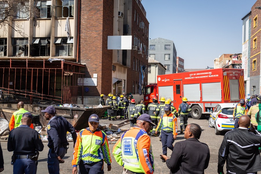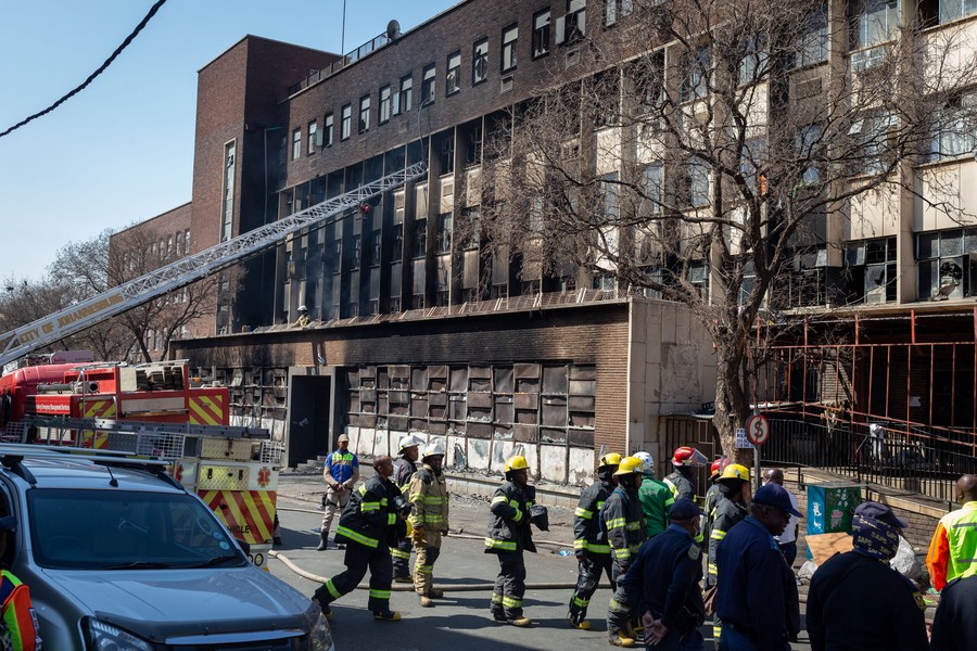 This photo, taken on Aug. 31, 2023, shows the site of a building fire in Johannesburg, South Africa. (Photo by Yeshiel Panchia/Xinhua)